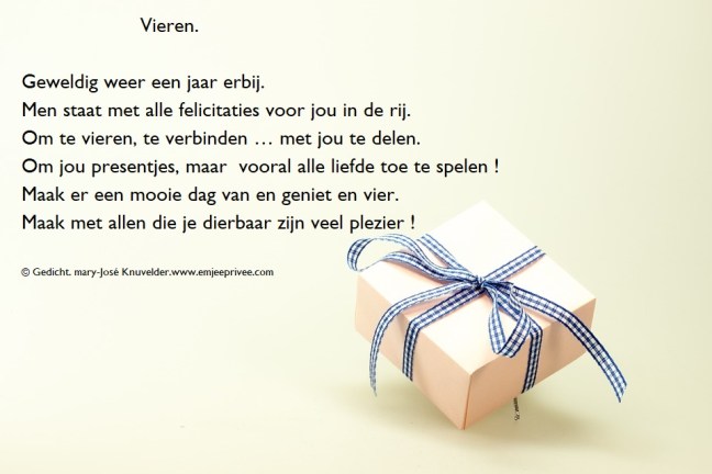 Gedicht: vieren Geplaatst op 15 april 201715 april 2019 door mjknuvelder Voor een vergroting, klik op de afbeelding Delen: Klik om te delen op Facebook (Opent in een nieuw venster) Facebook Klik om op Pinterest te delen (Opent in een nieuw venster) Pinterest