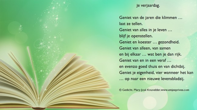 Gedicht: je verjaardag Geplaatst op 16 april 201715 april 2019 door mjknuvelder Voor een vergroting, klik op de afbeelding Delen: Klik om te delen op Facebook (Opent in een nieuw venster) Facebook Klik om op Pinterest te delen (Opent in een nieuw venster) Pinterest