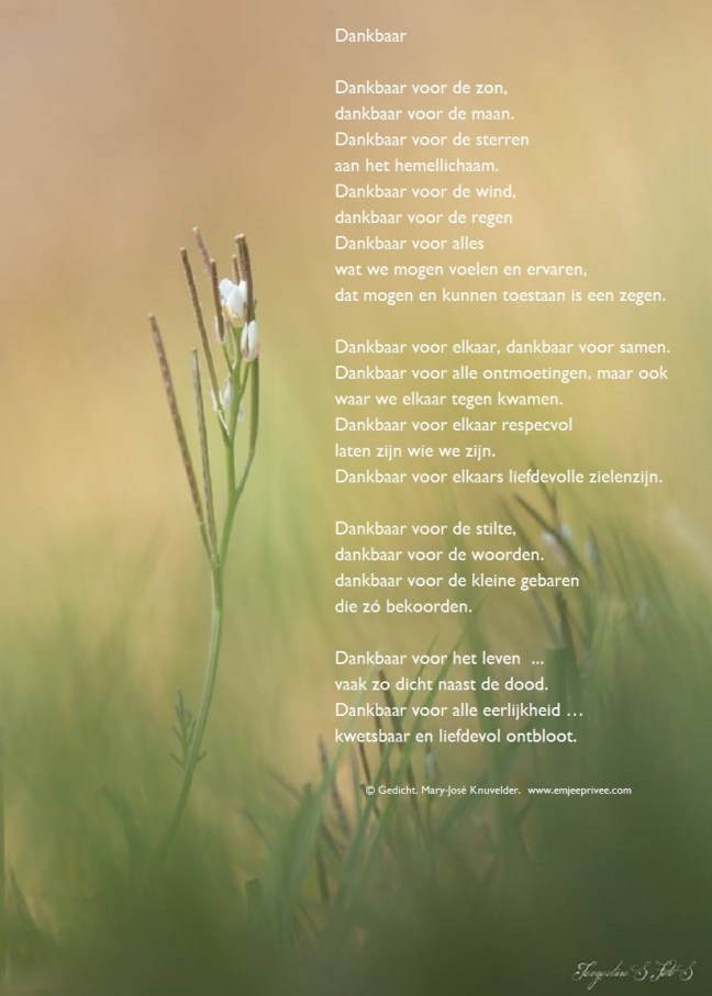 Gedicht: Dankbaar Geplaatst op 23 februari 201925 juli 2019 door Chantal Peters Voor een vergroting, klik op de afbeelding Delen: Klik om te delen op Facebook (Opent in een nieuw venster) Facebook Klik om op Pinterest te delen (Opent in een nieuw venster) Pinterest