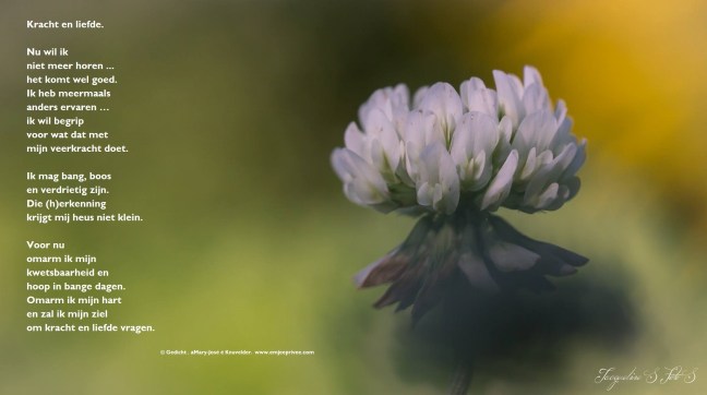 Gedicht: Kracht en liefde Geplaatst op 4 maart 201925 juli 2019 door Chantal Peters Voor een vergroting, klik op de afbeelding Delen: Klik om te delen op Facebook (Opent in een nieuw venster) Facebook Klik om op Pinterest te delen (Opent in een nieuw venster) Pinterest