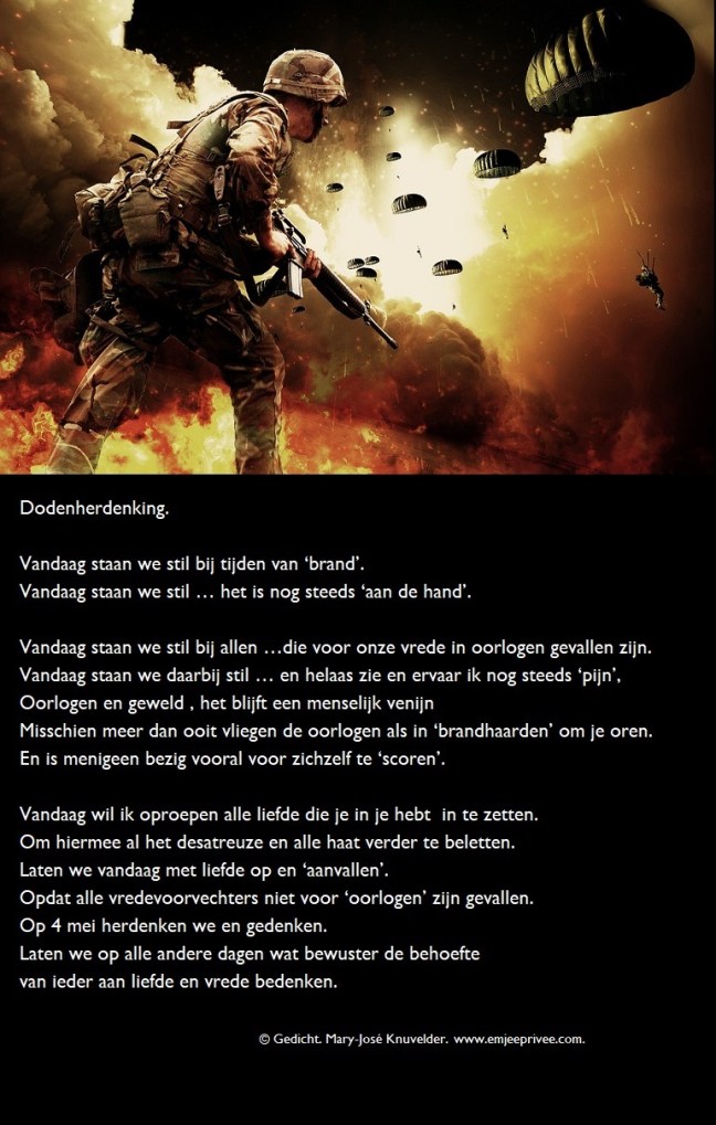 Gedicht: Dodeherdenking Geplaatst op 4 mei 20193 mei 2019 door mjknuvelder Voor een vergroting, klik op de afbeelding. Delen: Klik om te delen op Facebook (Opent in een nieuw venster) Facebook Klik om op Pinterest te delen (Opent in een nieuw venster) Pinterest