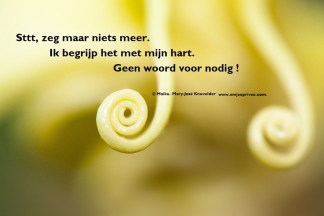 Haiku: Sttt, zeg maar niets meer Geplaatst op 18 mei 20198 mei 2019 door mjknuvelder Voor een vergroting, klik op de afbeelding Delen: Klik om te delen op Facebook (Opent in een nieuw venster) Facebook Klik om op Pinterest te delen (Opent in een nieuw venster) Pinterest