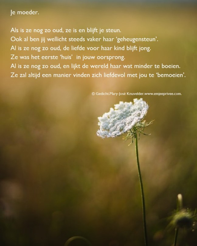 Gedicht: je moeder Geplaatst op 28 mei 20199 mei 2019 door mjknuvelder Voor een vergroting, klik op de afbeelding Delen: Klik om te delen op Facebook (Opent in een nieuw venster) Facebook Klik om op Pinterest te delen (Opent in een nieuw venster) Pinterest