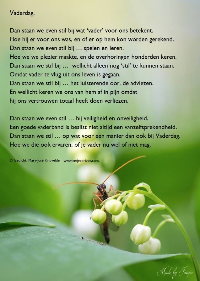 Gedicht: vaderdag Geplaatst op 15 juni 201910 juni 2019 door mjknuvelder Voor een vergroting, klik op de afbeelding Delen: Klik om te delen op Facebook (Opent in een nieuw venster) Facebook Klik om op Pinterest te delen (Opent in een nieuw venster) Pinterest