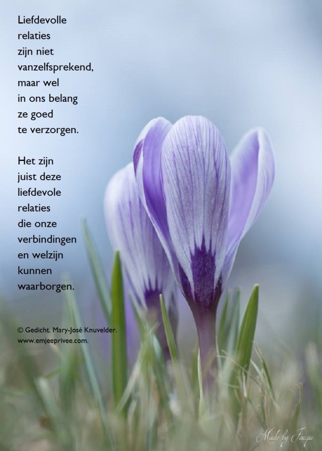 Gedicht: liefdevolle relaties. Geplaatst op 26 juni 201918 juni 2019 door mjknuvelder Voor een vergroting, klik op de afbeelding Delen: Klik om te delen op Facebook (Opent in een nieuw venster) Facebook Klik om op Pinterest te delen (Opent in een nieuw venster) Pinterest