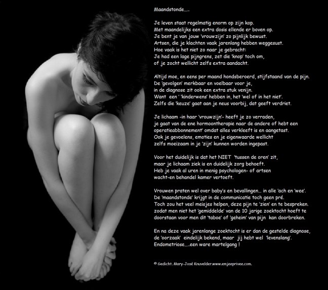 Gedicht: maandstonde – endometriose Geplaatst op 1 augustus 20191 juli 2019 door mjknuvelder Voor een vergroting, klik op de afbeelding Delen: Klik om te delen op Facebook (Opent in een nieuw venster) Facebook Klik om op Pinterest te delen (Opent in een nieuw venster) Pinterest