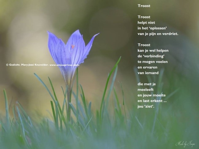 Gedicht: troost Geplaatst op 18 september 201928 augustus 2019 door mjknuvelder Voor een vergroting, klik op de afbeelding Delen: Klik om te delen op Facebook (Opent in een nieuw venster) Facebook Klik om op Pinterest te delen (Opent in een nieuw venster) Pinterest