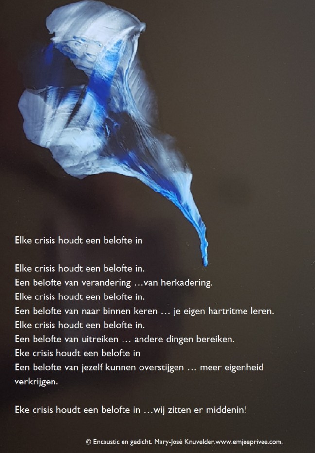 Gedicht. Elke crisis houdt een belofte in. Geplaatst op 22 maart 2020 door mjknuvelder Voor een vergroting, klik op de afbeelding Delen: Klik om te delen op Facebook (Opent in een nieuw venster) Facebook Klik om op Pinterest te delen (Opent in een nieuw venster) Pinterest