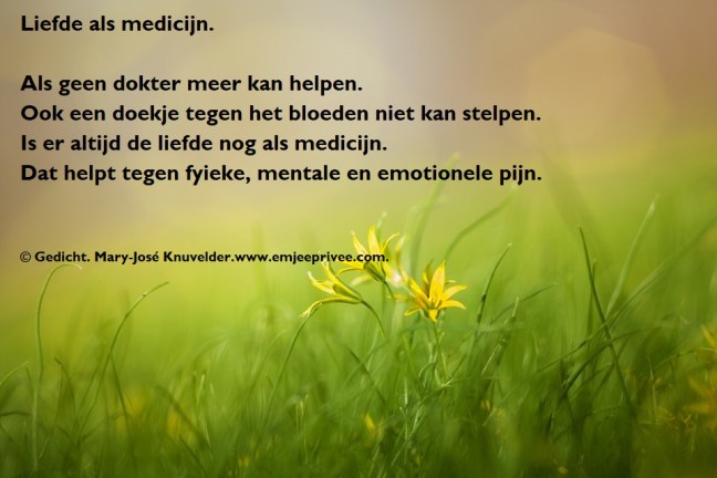 Gedicht. Liefde als medicijn. Geplaatst op 12 augustus 202022 maart 2020 door mjknuvelder Voor een vergroting, klik op de afbeelding Delen: Klik om te delen op Facebook (Opent in een nieuw venster) Facebook Klik om op Pinterest te delen (Opent in een nieuw venster) Pinterest