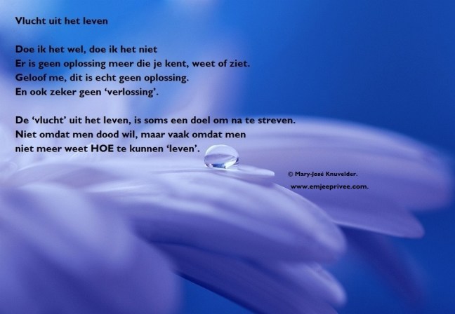 Gedicht. Vlucht uit het leven. Geplaatst op 2 september 202022 maart 2020 door mjknuvelder Voor een vergroting, klik op de afbeelding Delen: Klik om te delen op Facebook (Opent in een nieuw venster) Facebook Klik om op Pinterest te delen (Opent in een nieuw venster) Pinterest