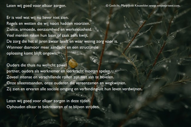 Gedicht. Laten wij goed voor elkaar zorgen. Geplaatst op 20 maart 202112 februari 2021 door mjknuvelder Voor een vergroting, klik op de afbeelding Delen: Klik om te delen op Facebook (Opent in een nieuw venster) Facebook Klik om op Pinterest te delen (Opent in een nieuw venster) Pinterest