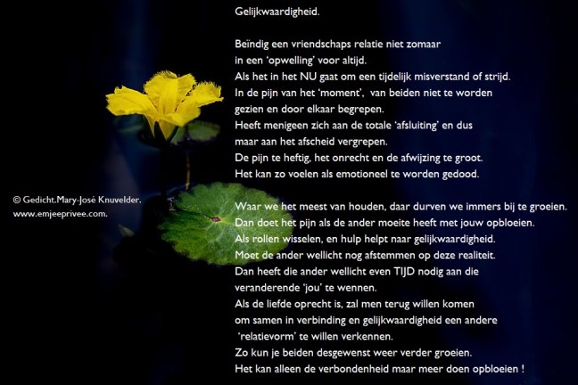 Gedicht. Gelijkwaardigheid. Geplaatst op 22 maart 202119 januari 2021 door mjknuvelder Voor een vergroting, klik op de afbeelding Delen: Klik om te delen op Facebook (Opent in een nieuw venster) Facebook Klik om op Pinterest te delen (Opent in een nieuw venster) Pinterest