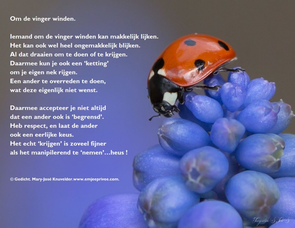 Gedicht. Om de vinger winden. Geplaatst op 28 augustus 20215 juli 2021 door mjknuvelder Voor een vergroting, klik op de afbeelding. Delen: Klik om te delen op Facebook (Opent in een nieuw venster) Facebook Klik om op Pinterest te delen (Opent in een nieuw venster) Pinterest
