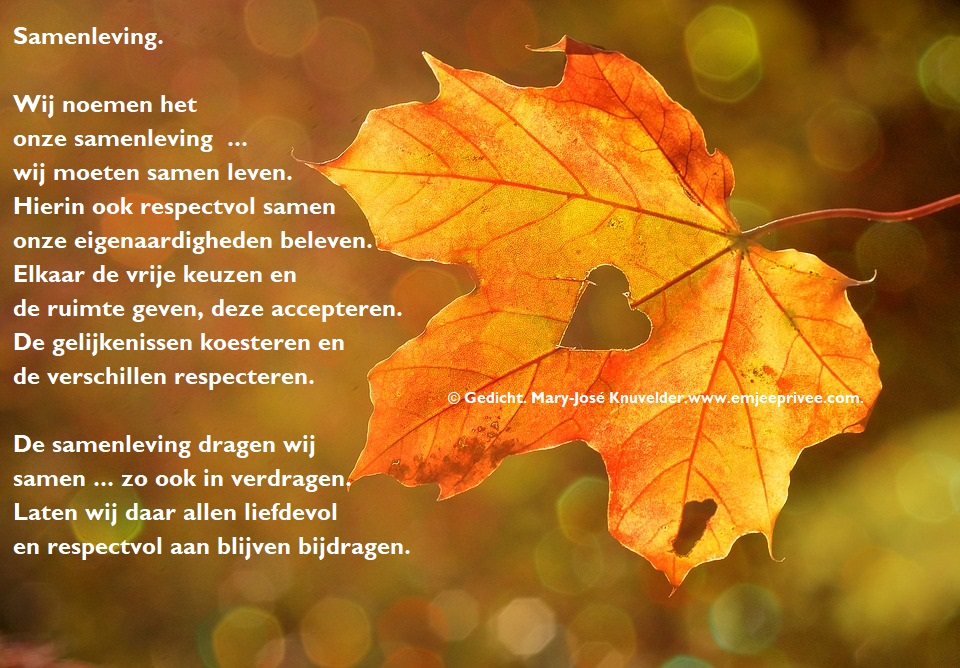 Mooi lieve MJ, dat zet je ook aan het denken: samenleving…Kortom…samen-leven en klopt ook ….dat doe je samen. En eigenlijk maakt die diversiteit het interessant. En ja…ook verdraagzaamheid en elkaar vrij laten in de keuzes…en karaktereigenschappen. Wel mooi om hier even bij stil te staan. Dank je, erg mooi ❤