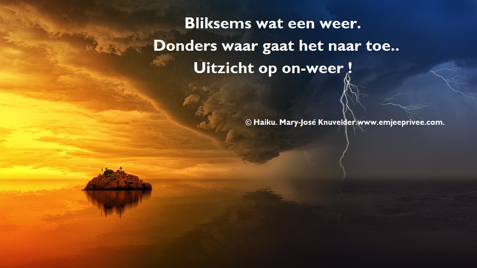 Haiku. Bliksems wat een weer Geplaatst op 13 maart 202224 oktober 2021 door mjknuvelder Voor een vergroting, klik op de afbeelding. Delen: Klik om te delen op Facebook (Opent in een nieuw venster) Facebook Klik om op Pinterest te delen (Opent in een nieuw venster) Pinterest