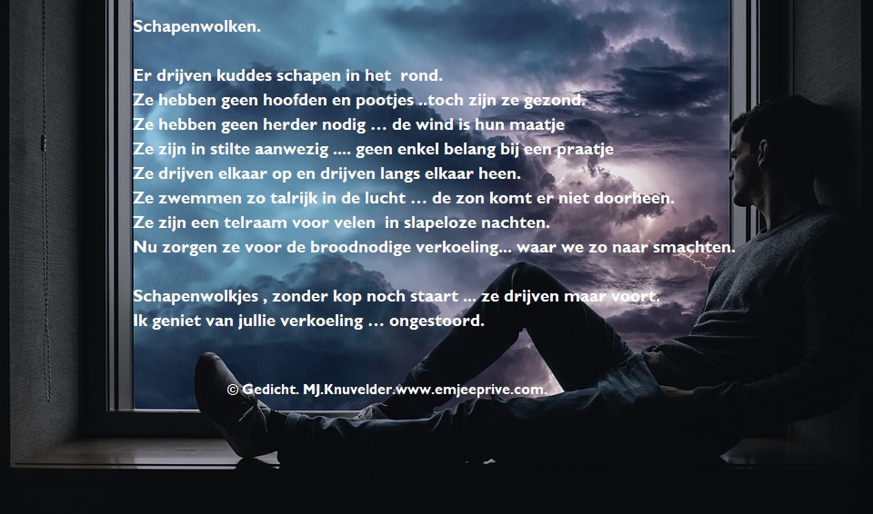 Gedicht. Schapenwolken Geplaatst op 4 mei 202217 maart 2022 door mjknuvelder Voor een vergroting, klik op de afbeelding. Delen: Klik om te delen op Facebook (Opent in een nieuw venster) Facebook Klik om op Pinterest te delen (Opent in een nieuw venster) Pinterest