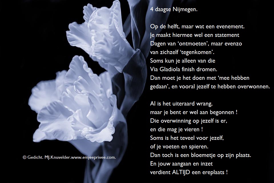 Het was fantastisch om er aan mee te doen, 1 grote massa lopende mensen, jong en oud, ieder op z’n eigen tempo en ………. Via Gladiola oplopen en van wildvreemden bloemen krijgen was helemaal geweldig, dan kruisje halen en toen was het opeens op, je zakt in elkaar en kan geen meter meer lopen, totaal op (was mijn ervaring)