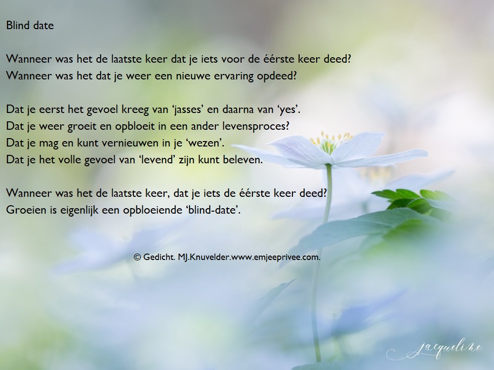 De beste en grootste ‘blind date’ was op 16 maart 2016, zeer dankbaar hiervoor, verder gebeurt het mij zeker 1 per week, niet iets groots, maar wel iets dat een wezenlijk verschil geeft in mijn leven LikeLike