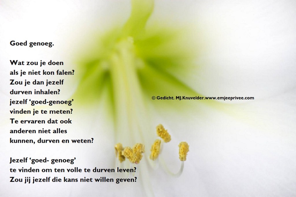 Gedicht. Goed genoeg Geplaatst op 29 september 202329 augustus 2023 door mjknuvelder Voor een vergroting, klik op de afbeelding Delen: Klik om te delen op Facebook (Opent in een nieuw venster) Facebook Klik om op Pinterest te delen (Opent in een nieuw venster) Pinterest