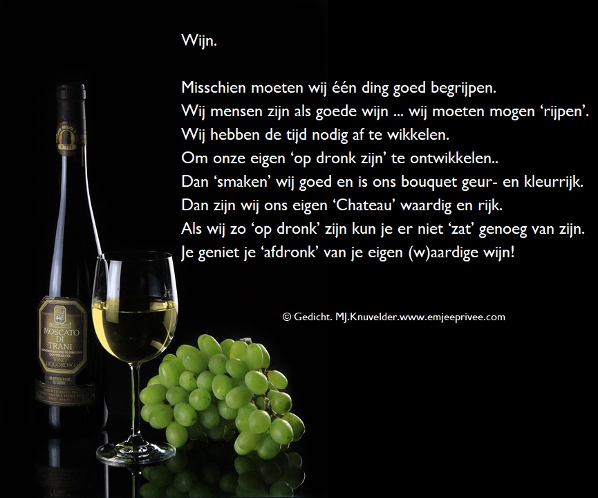 Gedicht. Wijn Geplaatst op 14 maart 202419 februari 2024 door mjknuvelder Voor een vergroting, klik op de afbeelding Delen: Klik om te delen op Facebook (Opent in een nieuw venster) Facebook Klik om op Pinterest te delen (Opent in een nieuw venster) Pinterest