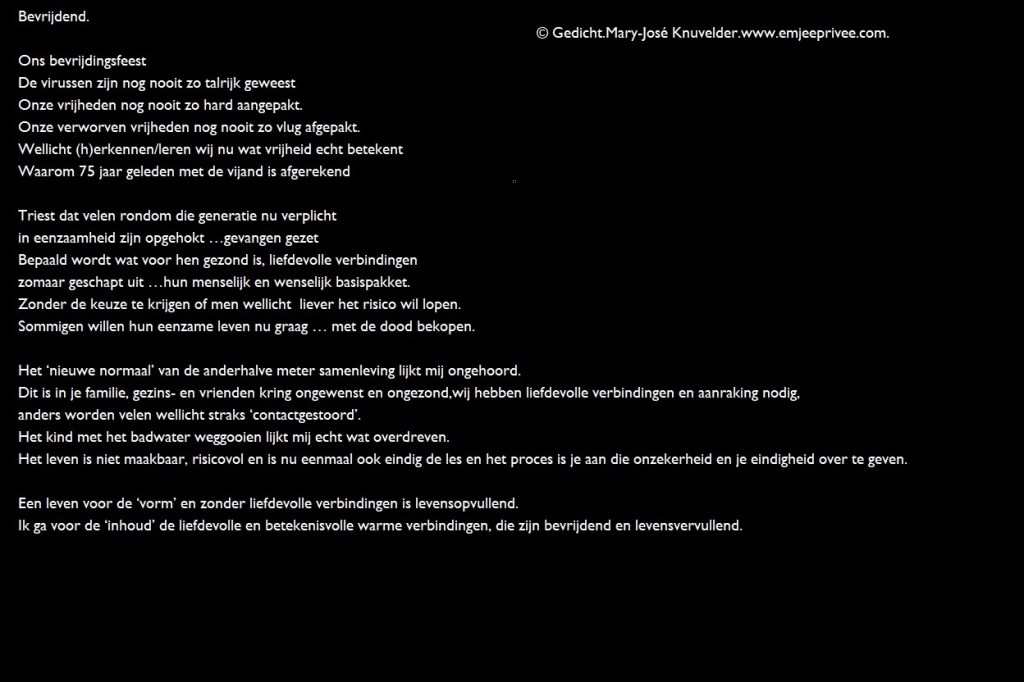 GEDICHT (Opdat wij niet vergeten) Bevrijdend Geplaatst op 1 mei 202429 april 2024 door mjknuvelder Voor een vergroting, klik op de afbeelding Delen: Klik om te delen op Facebook (Opent in een nieuw venster) Facebook Klik om op Pinterest te delen (Opent in een nieuw venster) Pinterest