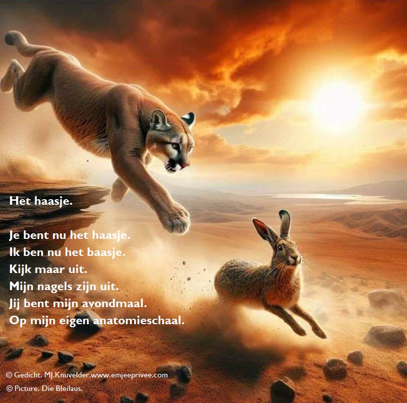 GEDICHT. Het haasje Geplaatst op 27 juli 20241 mei 2024 door mjknuvelder Voor een vergroting, klik op de afbeelding Delen: Delen: Klik om te delen op Facebook (Opent in een nieuw venster) Facebook Klik om op Pinterest te delen (Opent in een nieuw venster) Pinterest