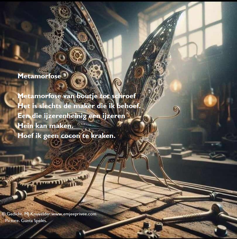 GEDICHT. Metamorfose Geplaatst op 22 augustus 20248 mei 2024 door mjknuvelder Voor een vergroting, klik op de afbeelding Delen: Klik om te delen op Facebook (Opent in een nieuw venster) Facebook Klik om op Pinterest te delen (Opent in een nieuw venster) Pinterest