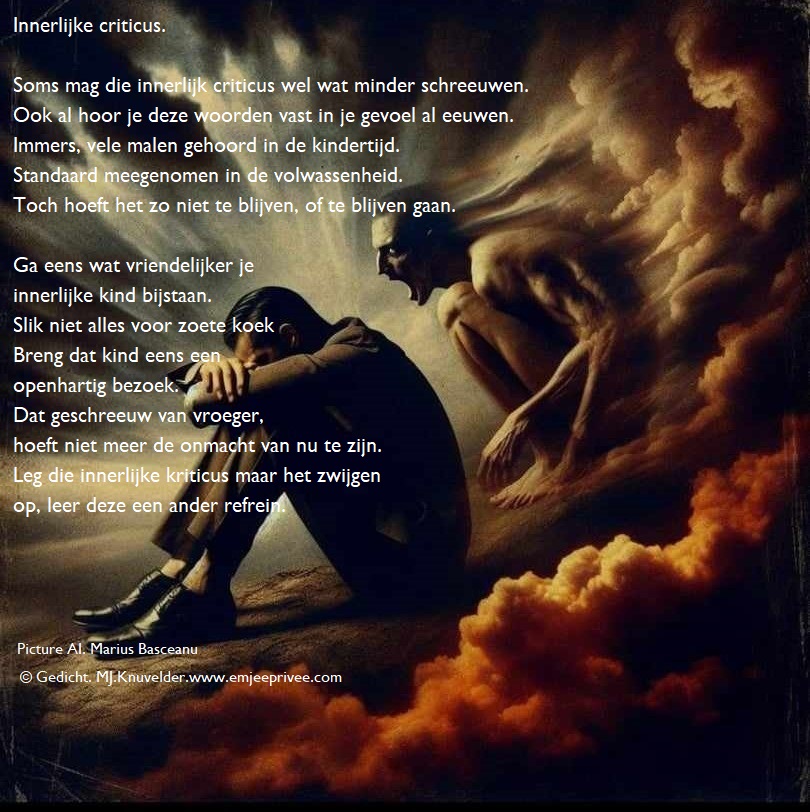 GEDICHT. Innerlijke criticus Geplaatst op 23 augustus 202426 juli 2024 door mjknuvelder Voor een vergroting, klik op de afbeelding Delen: Klik om te delen op Facebook (Opent in een nieuw venster) Facebook Klik om op Pinterest te delen (Opent in een nieuw venster) Pinterest