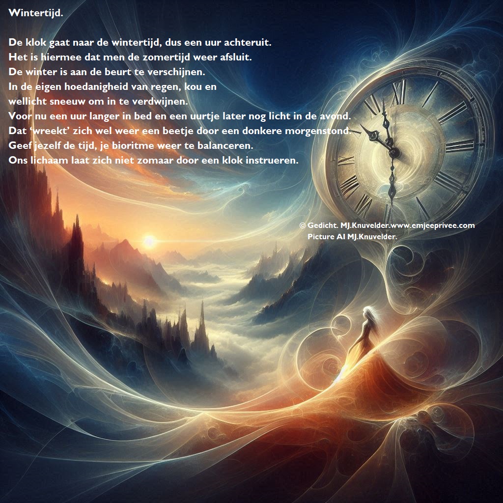 Gedicht. Wintertijd Geplaatst op 26 oktober 2024 door mjknuvelder Delen: Klik om te delen op Facebook (Opent in een nieuw venster) Facebook Klik om op Pinterest te delen (Opent in een nieuw venster) Pinterest