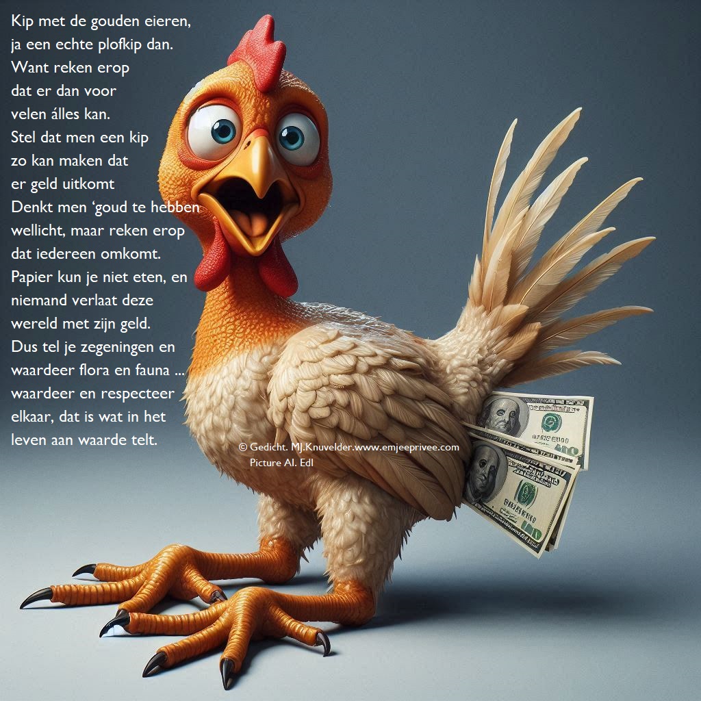 Gedicht. Kip met de gouden eieren Geplaatst op 25 november 202415 september 2024 door mjknuvelder Voor een vergroting, klik op de afbeelding Delen: Klik om te delen op Facebook (Opent in een nieuw venster) Facebook Klik om op Pinterest te delen (Opent in een nieuw venster) Pinterest
