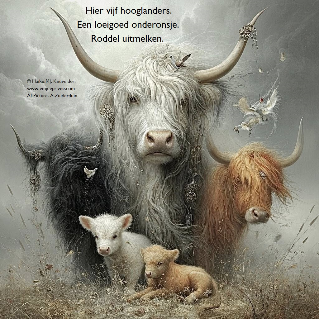 Haiku. Hier vijf hooglanders. Geplaatst op 11 januari 20252 augustus 2025 door mjknuvelder Voor een vergroting, klik op de afbeelding Delen: Klik om te delen op Facebook (Opent in een nieuw venster) Facebook Klik om op Pinterest te delen (Opent in een nieuw venster) Pinterest