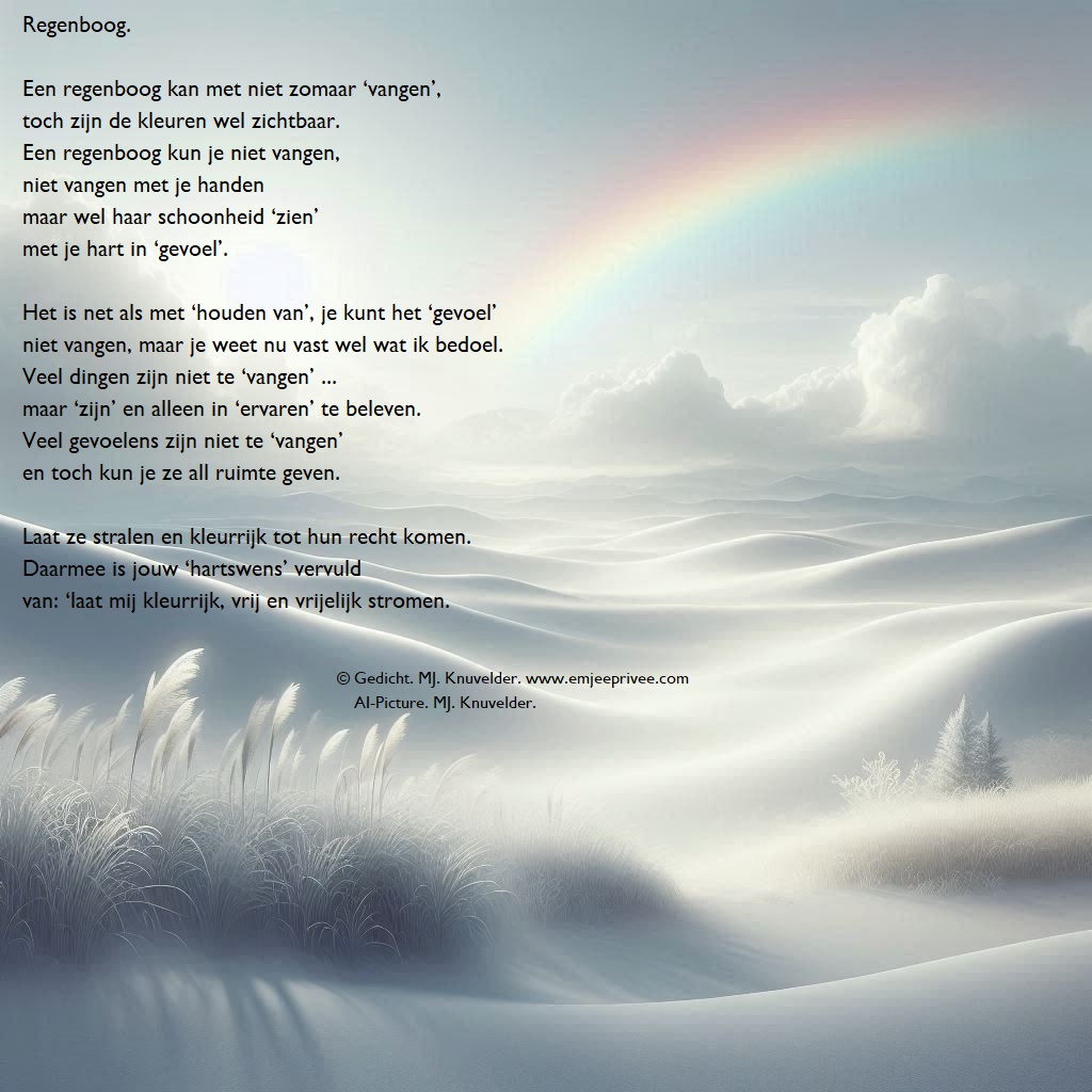 Gedicht. Regenboog Geplaatst op 9 maart 202520 februari 2025 door mjknuvelder Voor een vergroting, klik op de afbeelding Delen: Klik om te delen op Facebook (Opent in een nieuw venster) Facebook Klik om op Pinterest te delen (Opent in een nieuw venster) Pinterest