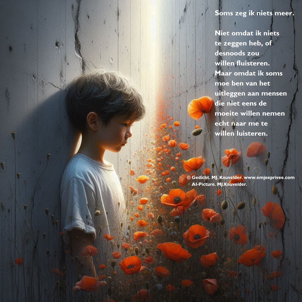Gedicht. Soms zeg ik niks meer Geplaatst op 24 juli 202516 mei 2025 door mjknuvelder Voor een vergroting, klik op de afbeelding Delen: Klik om te delen op Facebook (Opent in een nieuw venster) Facebook Klik om op Pinterest te delen (Opent in een nieuw venster) Pinterest