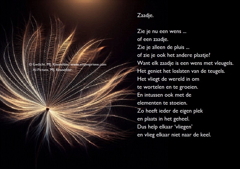 Gedicht. Zaadje Geplaatst op 9 augustus 20255 juni 2025 door mjknuvelder Voor een vergroting, klik op de afbeelding. Delen: Klik om te delen op Facebook (Opent in een nieuw venster) Facebook Klik om op Pinterest te delen (Opent in een nieuw venster) Pinterest
