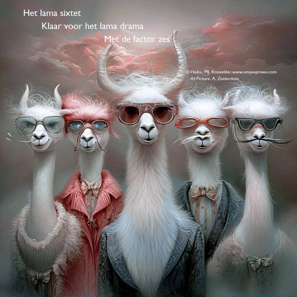 Haiku. Het lama sixtet Geplaatst op 8 november 20255 juli 2025 door mjknuvelder Voor een vergroting, klik op de afbeelding. Delen: Klik om te delen op Facebook (Opent in een nieuw venster) Facebook Klik om op Pinterest te delen (Opent in een nieuw venster) Pinterest