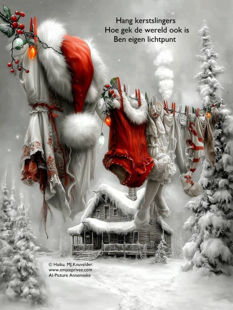 Haiku. Hang kerstslingers. Geplaatst op 21 december 202519 december 2025 door mjknuvelder Delen: Klik om te delen op Facebook (Opent in een nieuw venster) Facebook Klik om op Pinterest te delen (Opent in een nieuw venster) Pinterest