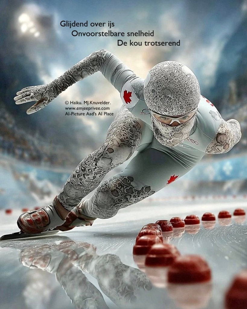 Haiku. Glijdend over ijs. Geplaatst op 15 februari 202614 februari 2026 door mjknuvelder Glijdend over ijs Onvoorstelbare snelheid De kou trotserend Delen: Share op Facebook (Opent in een nieuw venster) Facebook Delen op Pinterest (Opent in een nieuw venster) Pinterest