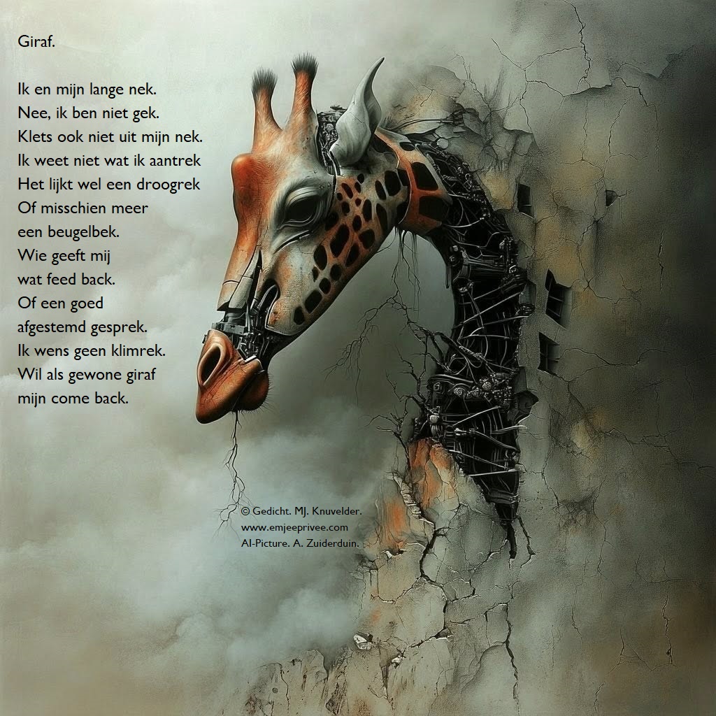 Gedicht. Giraf Geplaatst op 19 maart 202630 augustus 2025 door mjknuvelder Delen: Share op Facebook (Opent in een nieuw venster) Facebook Delen op Pinterest (Opent in een nieuw venster) Pinterest