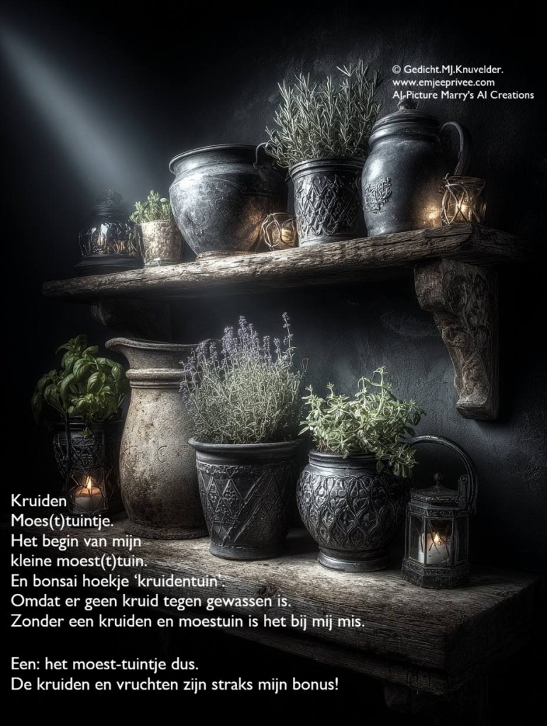 Gedicht. Kruiden moes(t)tuintje Geplaatst op 31 maart 202612 februari 2026 door mjknuvelder Voor een vergroting, klik op de afbeelding. Delen: Share op Facebook (Opent in een nieuw venster) Facebook Delen op Pinterest (Opent in een nieuw venster) Pinterest